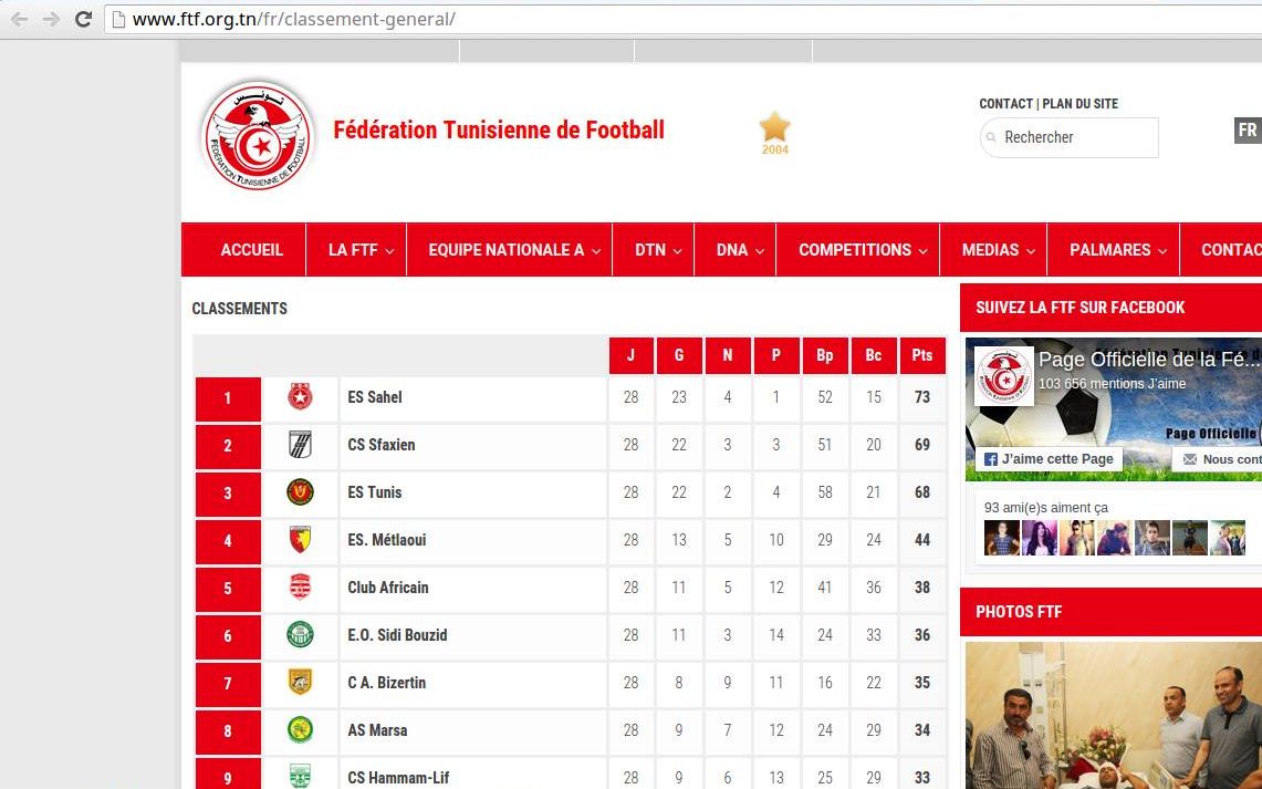 La Fédération Tunisienne de Football (FTF) a publié son site web un classement erroné du championnat de ligue 1 en Tunisie. En effet, le titre du championnat tunisien pour cette saison 2015/2016 n’a toujours pas été décerné alors que d’habitude, le champion est connu depuis plusieurs journées.